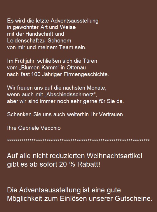 Ich freue mich, Sie alle bei der Adventsausstellung zu sehen, an Weihnachten und auch im neuen Jahr. Diese Zeit genießen wir und feiern ein paar „letzte Male“.